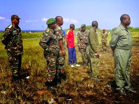 Baadhi ya Maafisa wa Jeshi la Ulinzi la Wananchi wa Tanzania (JWTZ) wakiwa eneo la tukio kuangalia mabaki ya ndegevita hiyo iliyopata ajali leo.